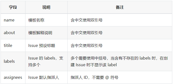 在新建的markdown文件中可以配置front-matter信息,包括Issue模板的介绍、Issue标题、指定负责人、指定Label等。这样做的目的是使得模板的结构更加清晰、意图更加地明确、预设的内容也能在创建Issue进一步提高效率。