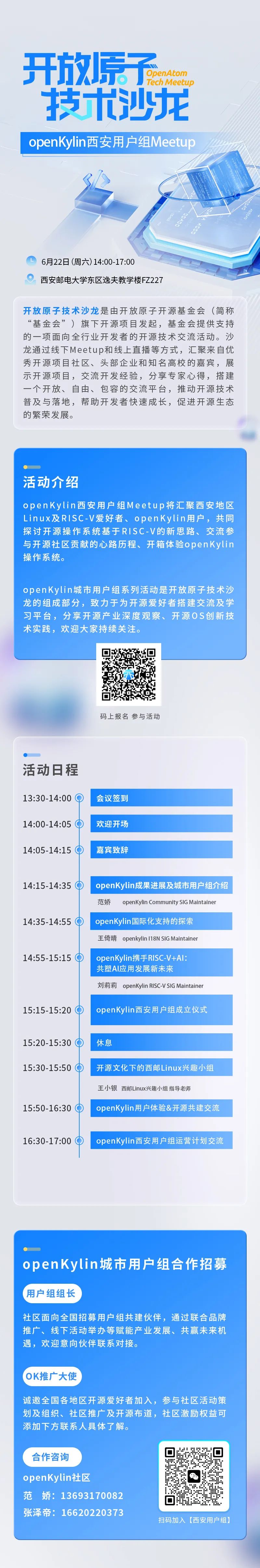 6月22日,openKylin西安用户组Meetup将在西安邮电大学举办。本次活动将汇聚西安地区Linux及RISC-V爱好者、openKylin用户。共同探讨开源操作系统基于RISC-V的新思路,交流参与开源社区贡献的心路历程,开箱体验openKylin操作系统。