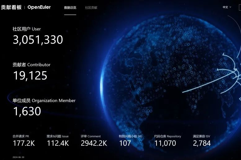 截至2024年6月30日,openEuler社区用户累计超过305万。超过1.9万名开发者在社区持续贡献。社区累计产生177.2K个PR、112.4K条Issue。目前,加入openEuler社区的单位成员1630家,本月新增55家。