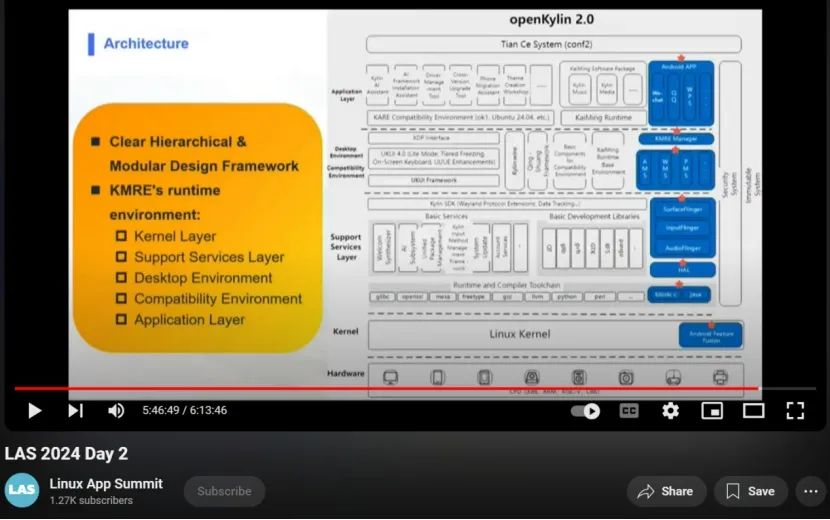 LAS 2024采用线上线下结合的形式,openKylin社区通过线上方式参与,并带来了精彩的演讲,展示了创新的Kylin Mobile Runtime Environment(KMRE)技术方案。