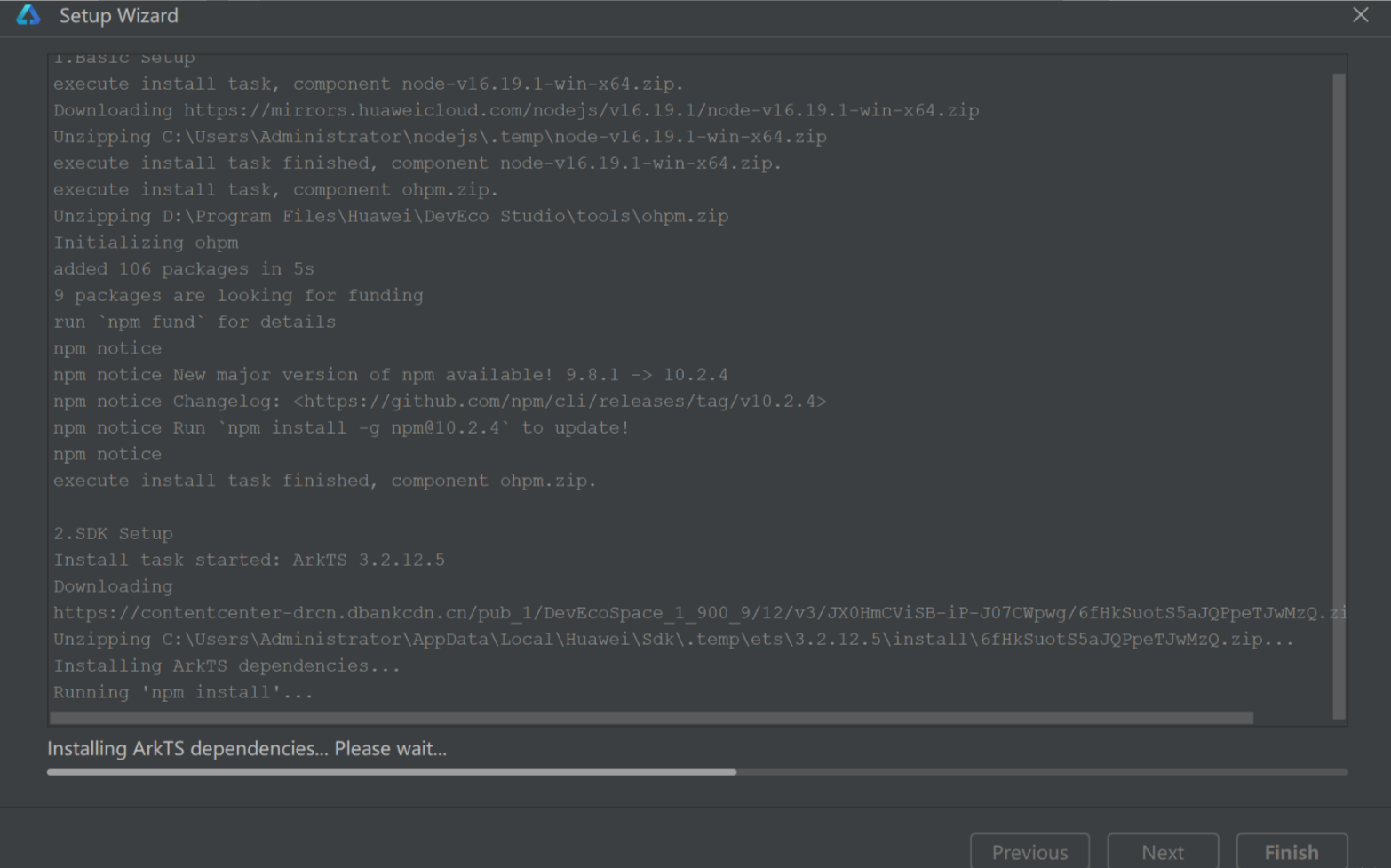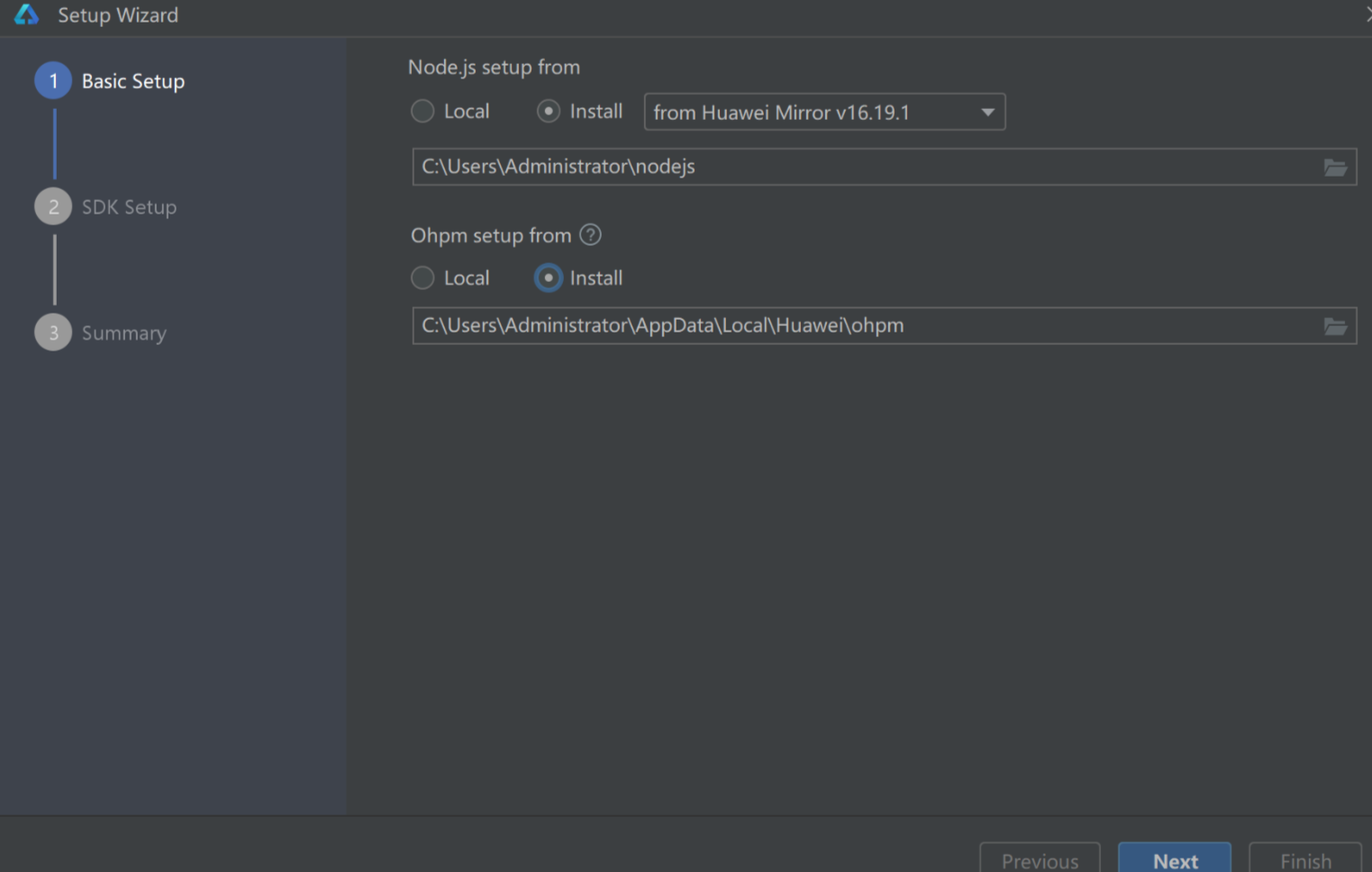 首先需要进行基础配置,包括Node.js与Ohpm的安装路径设置,选择从华为镜像下载至合适的路径。