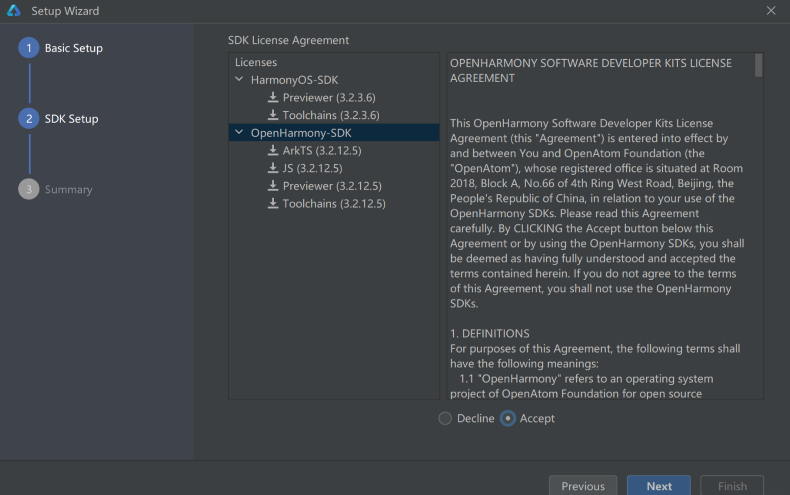 4.点击’Next’后会显示’SDK License Agreement’,阅读相关协议后,勾选’Accept’。