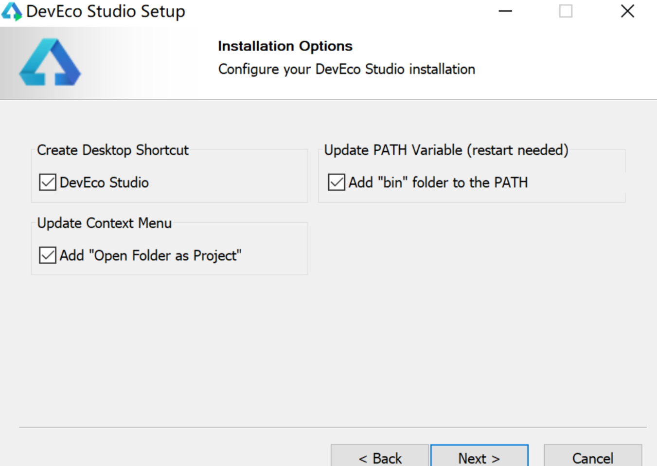 如下安装选项界面勾选DevEco Studio后,单击“Next”,直至安装完成。