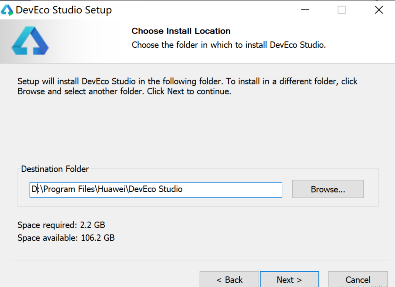 下载完成后,双击下载的“deveco-studio-xxxx.exe”,进入DevEco Studio安装向导,在如下界面选择安装路径,默认安装于“C:\Program Files”下,也可以单击“Browse…”指定其他安装路径,然后单击“Next”。