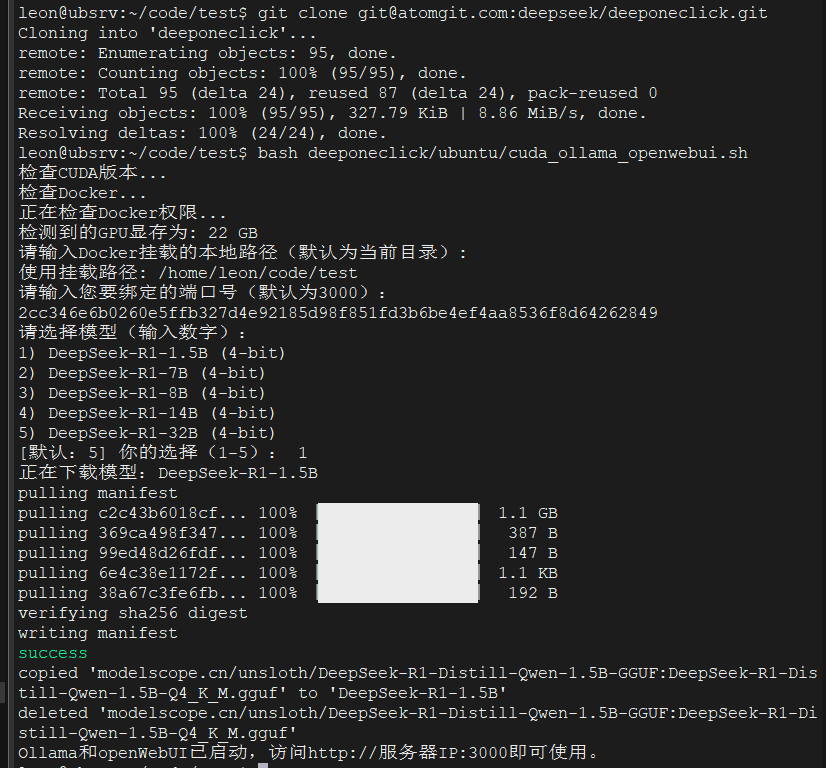 如何无特殊配置需求,一路回车,跳过所有交互,直到屏幕输出:“Ollama和openWebUI已启动,访问http://服务器IP:${user_port}” 即可。