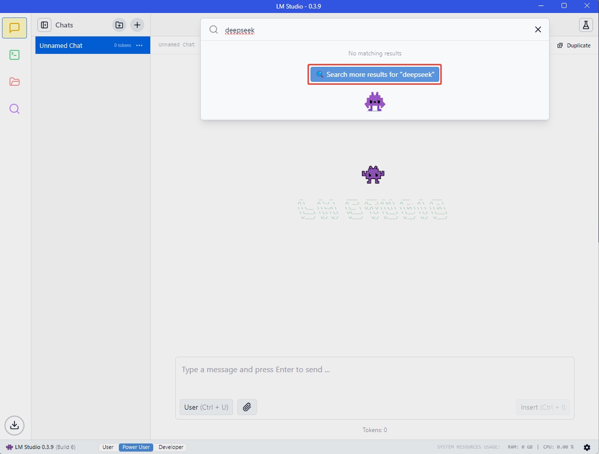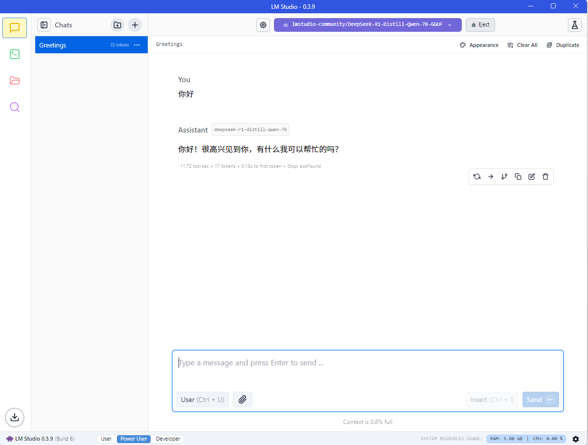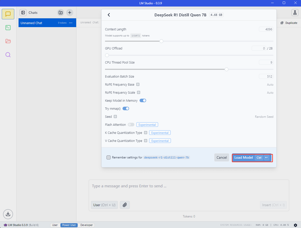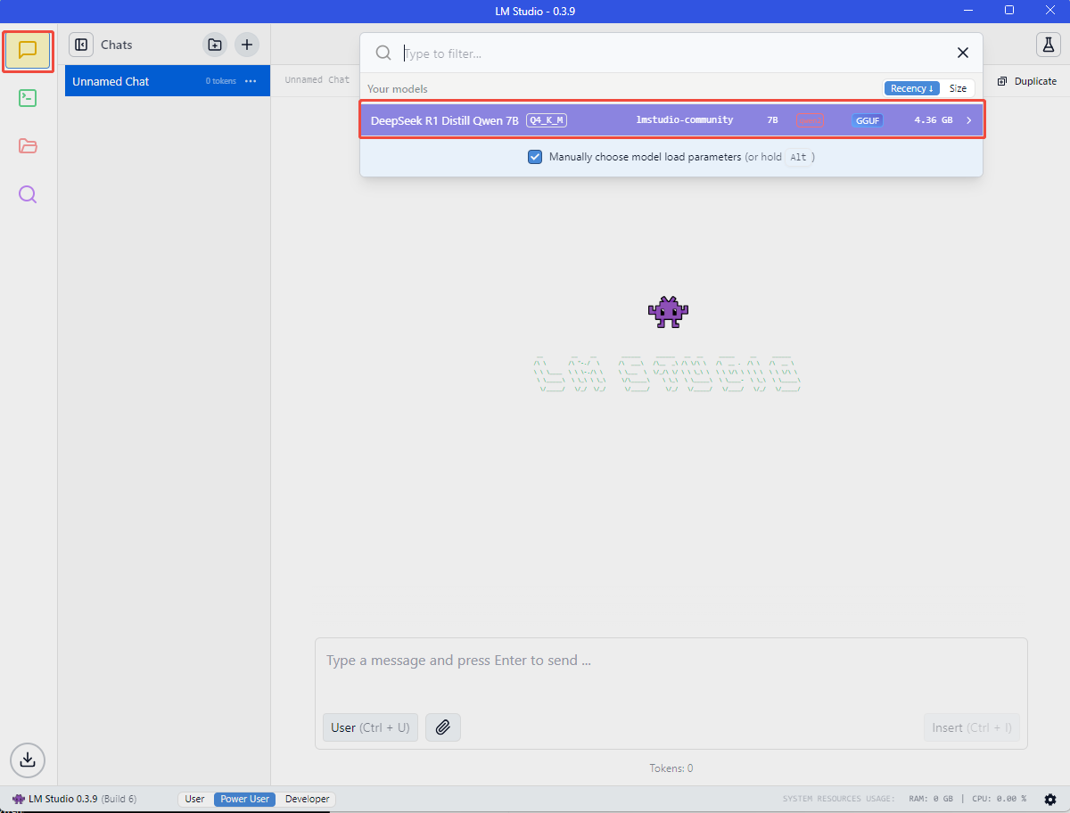 4.3 点击侧边栏的 chat,然后选择 DeepSeek R1 模型,并 Load Model