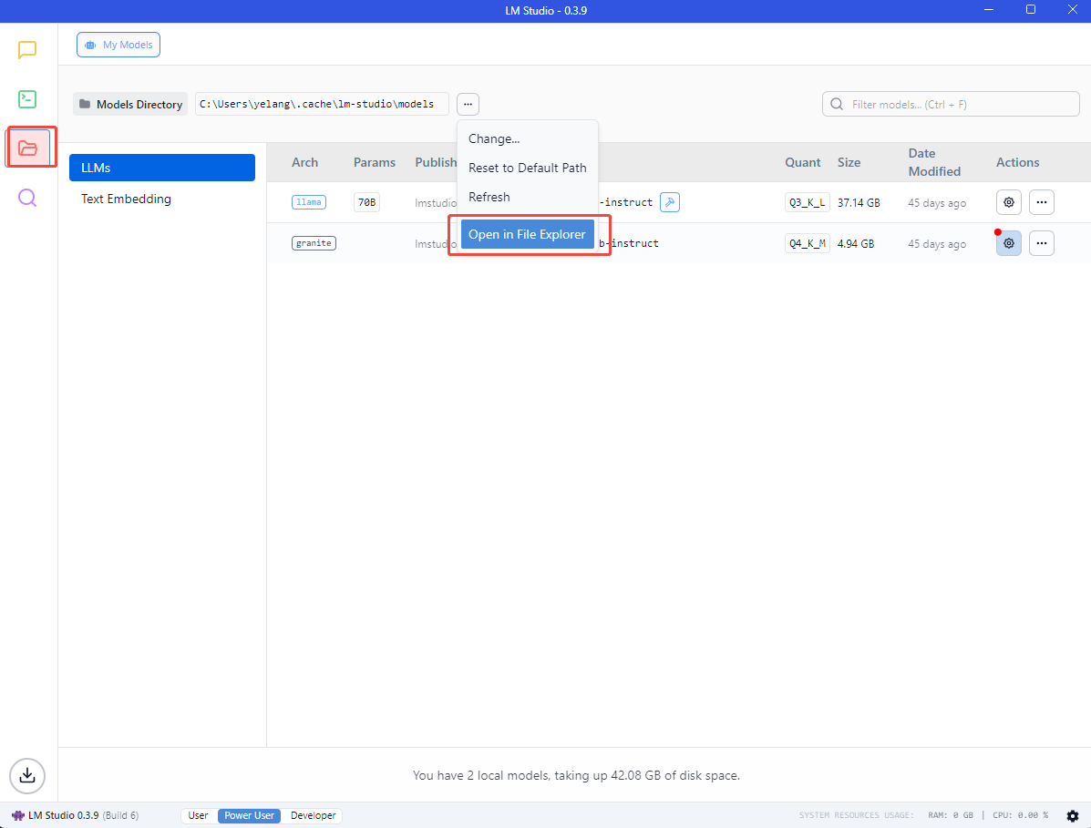 4.2 点击侧边栏 My Models 然后选择 Open in File Explorer, 双击 lmstudio-community 进入模型列表,将4.1下载的 DeepSeek-R1-Distill-Qwen-7B-GGUF 文件夹复制到目录下