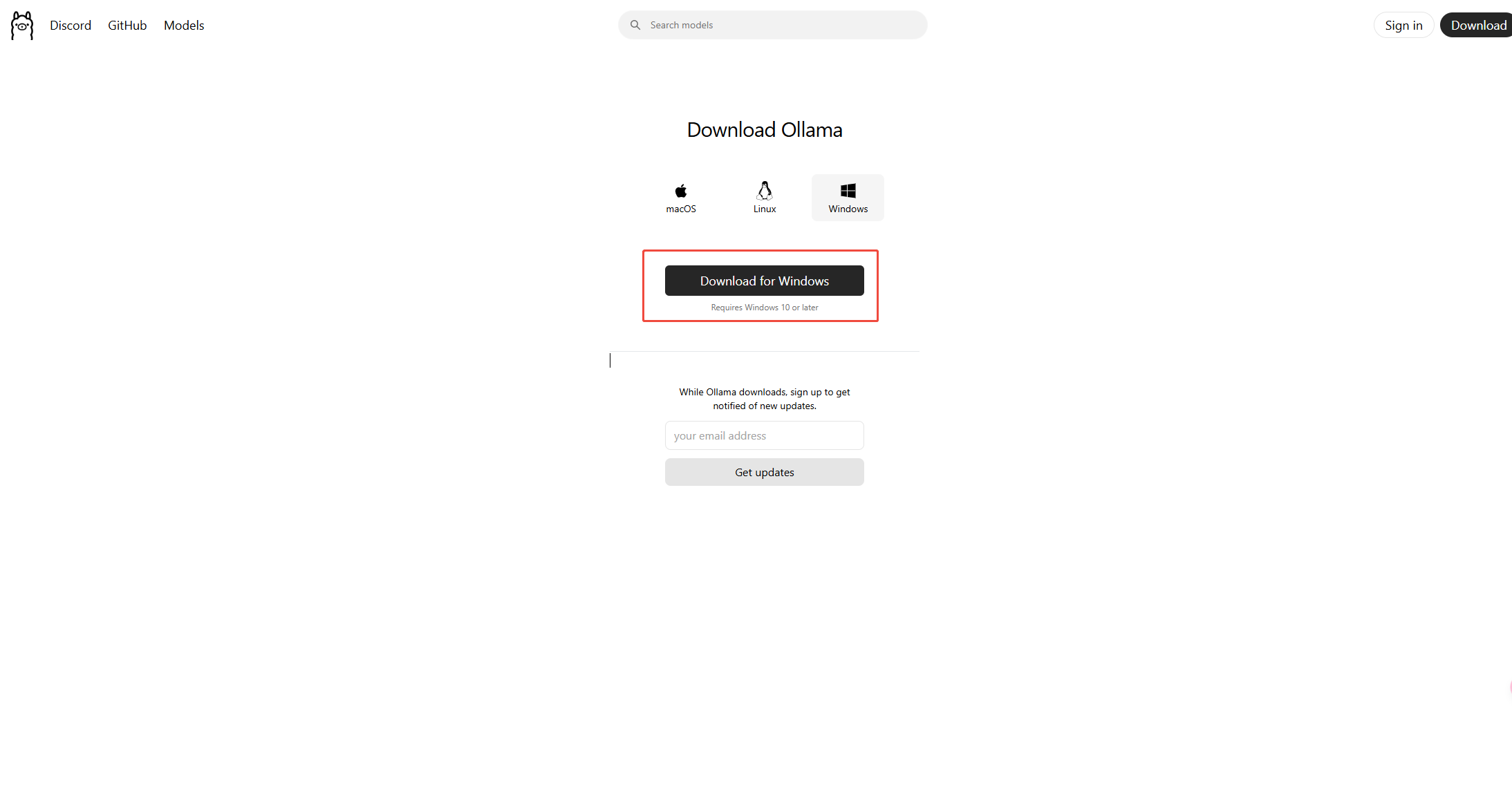 点击下图所示的 Download for windows 按钮即可开始下载 ollama
