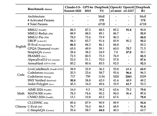 表3. DeepSeek-R1 与其他代表性模型的定量对比结果。