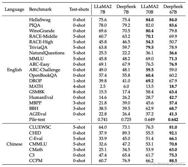 表2. DeepSeek LLM 基准测试的主要结果。加粗数字表示 4 个模型中最优的结果。对于 Pile-test,作者报告比特每字节(BPB);对于 DROP,作者报告 F1 分数;对于其他任务,作者报告 准确率。请注意,测试时的 shots 取最大值,但在某些情况下,由于上下文长度限制或同一段落中可用的 few-shot 示例数量有限(如 RACE 等阅读理解任务),可能会使用更少的 shots。