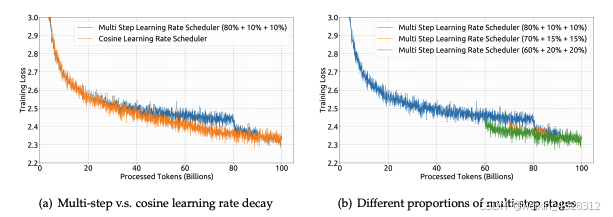 图2. DeepSeek使用不同的学习率调度器或不同的调度器参数的训练损失曲线。模型规模为 16 亿参数,在包含 1000 亿个标记的数据集上进行训练。