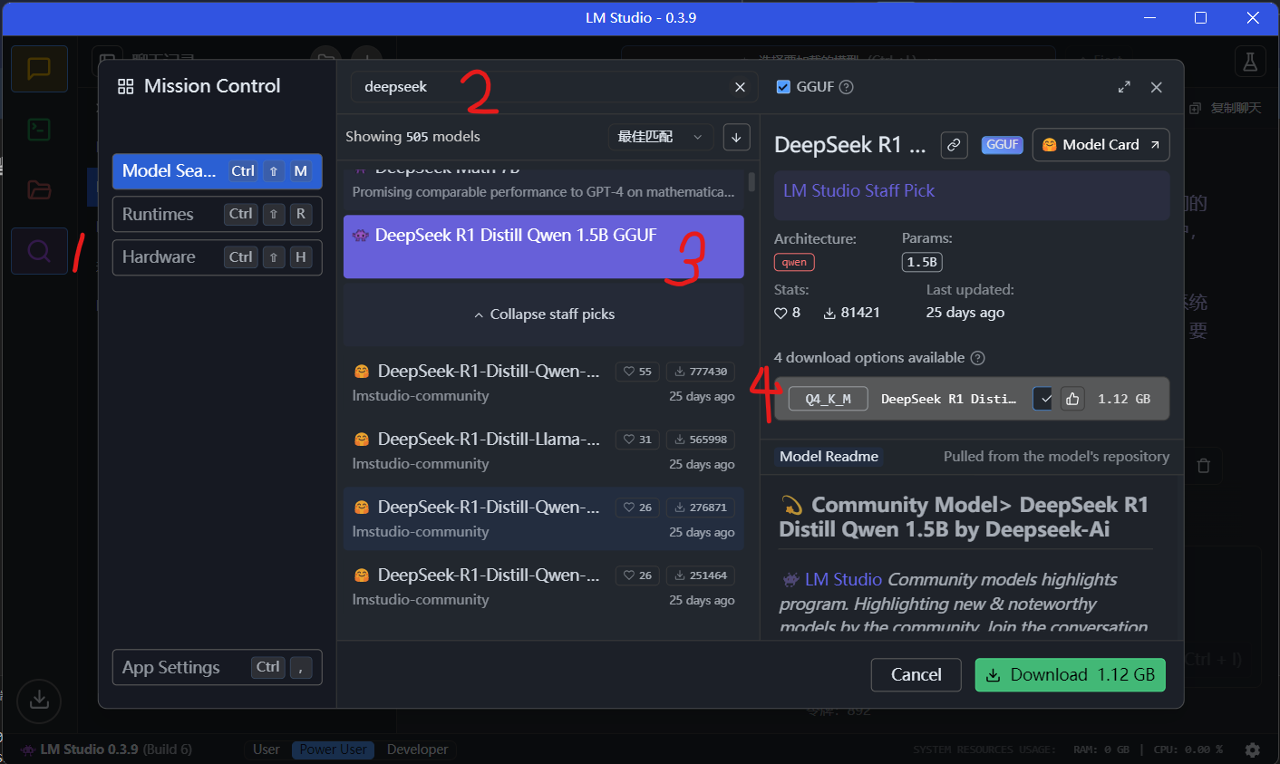 - 在结果里选择一个模型,初次体验推荐先安装一个最小版本:DeepSeek-R1-Distill-Qwen-1.5B-GGUF。注:尽量选择有紫色LM Studio图标的模型,从LM Studio社区下载速度较快。