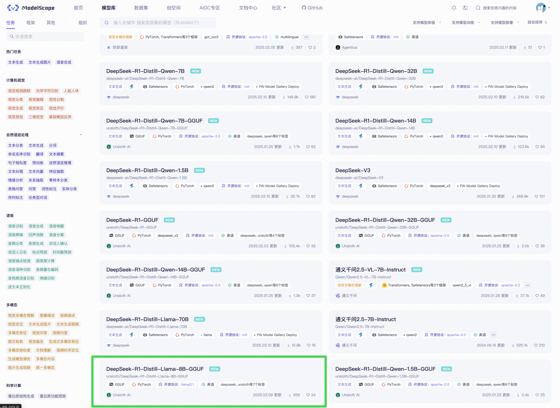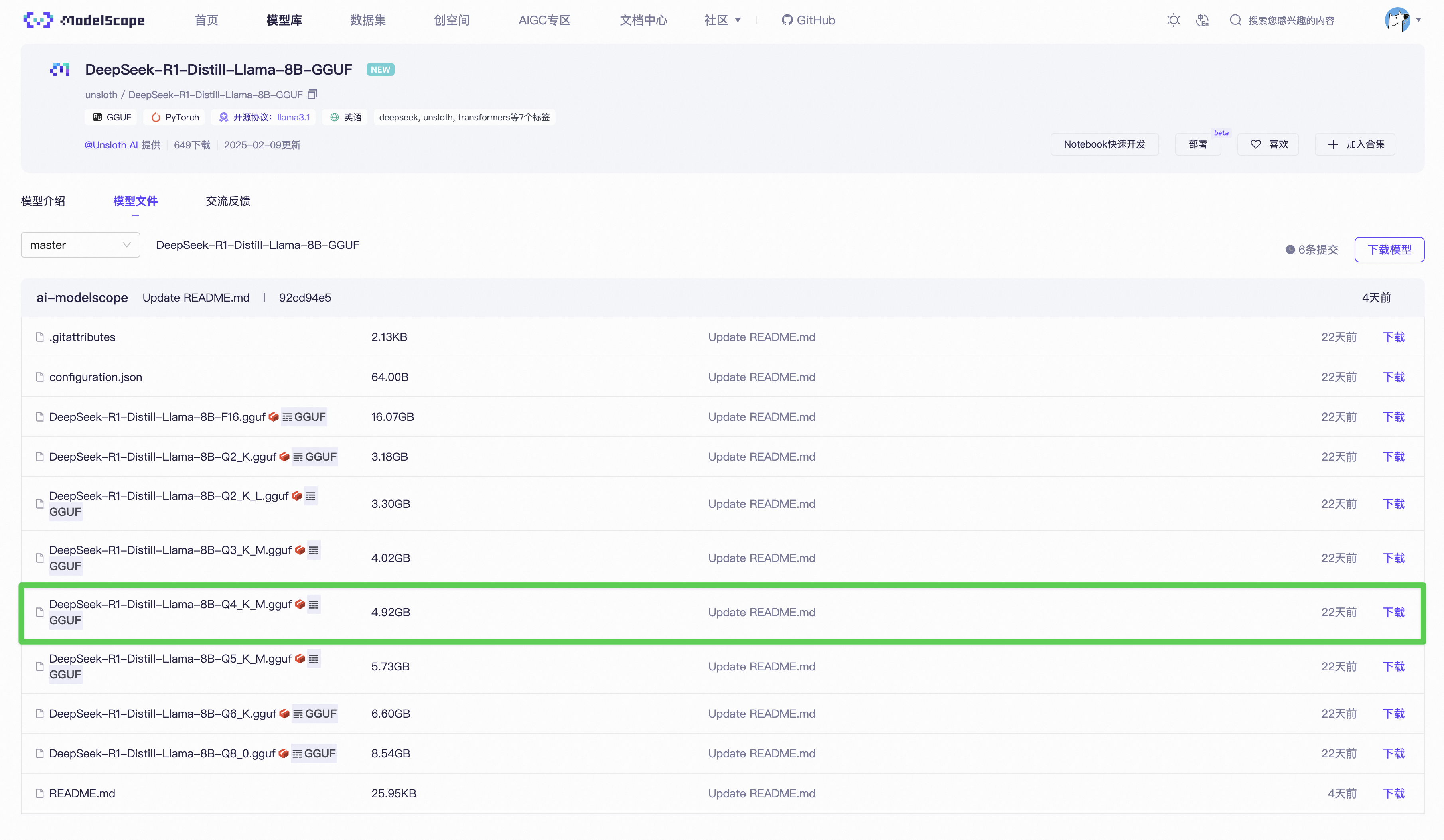 我们在魔搭社区进行模型文件下载, 在搜索栏中选择模型库, 键入DeepSeek R1进行搜索, 我们选择一个8b的版本, 注意需要GGUF文件