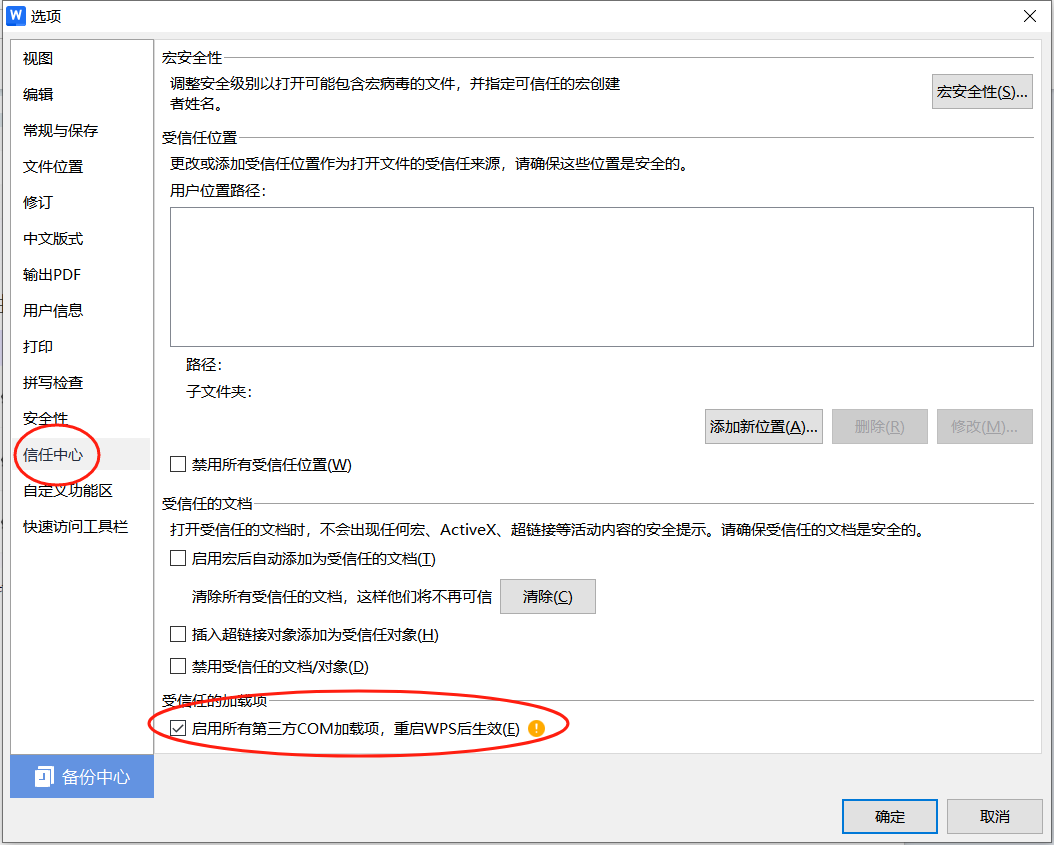 5.打开WPS软件,选择“文件”-“选项”—“信任中心”,勾选“启用所有第三方COM加载项”。