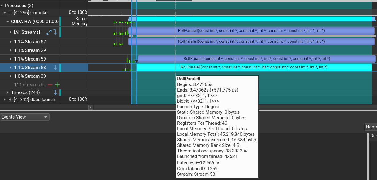 其中每个流执行的核函数共32*32=1024个线程,极限状态理论上会有24个流并行。