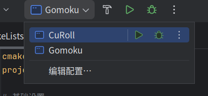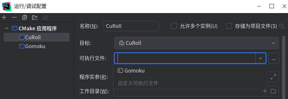 这里可以选择修改算子动态链接库的可执行文件为项目唯一输出的可执行文件Gomoku,这一操作会使得CuRoll配置可以一键同时编译 动态链接库CuRoll 与 可执行文件Gomoku 并 运行。点击应用后确定。 -