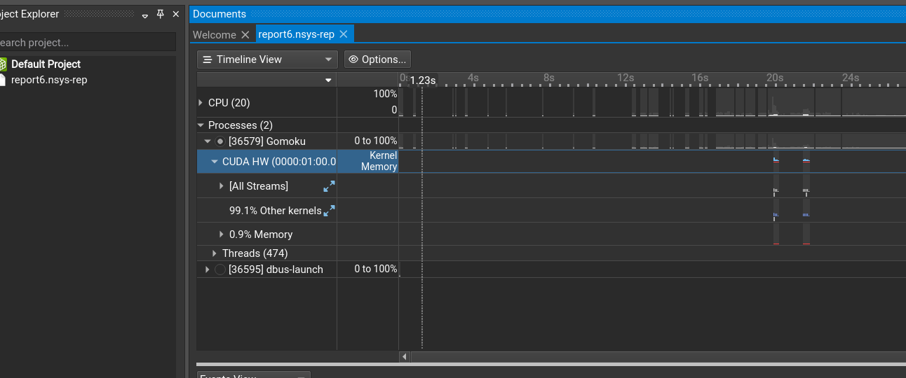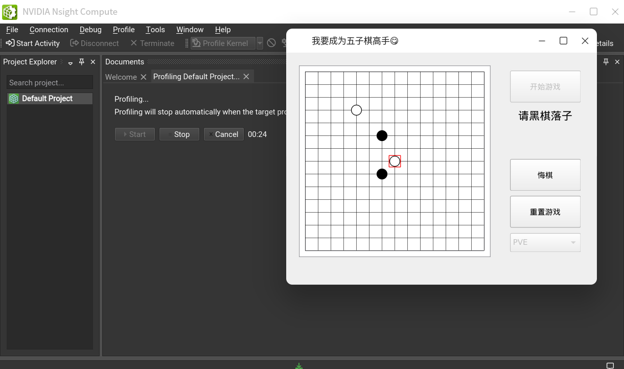 、 - 在程序界面右下角选择“PVE”选项后点击“开始游戏”,执黑棋落子一个后等待AI落子,当AI完成落子后点击NSight的stop按钮即可