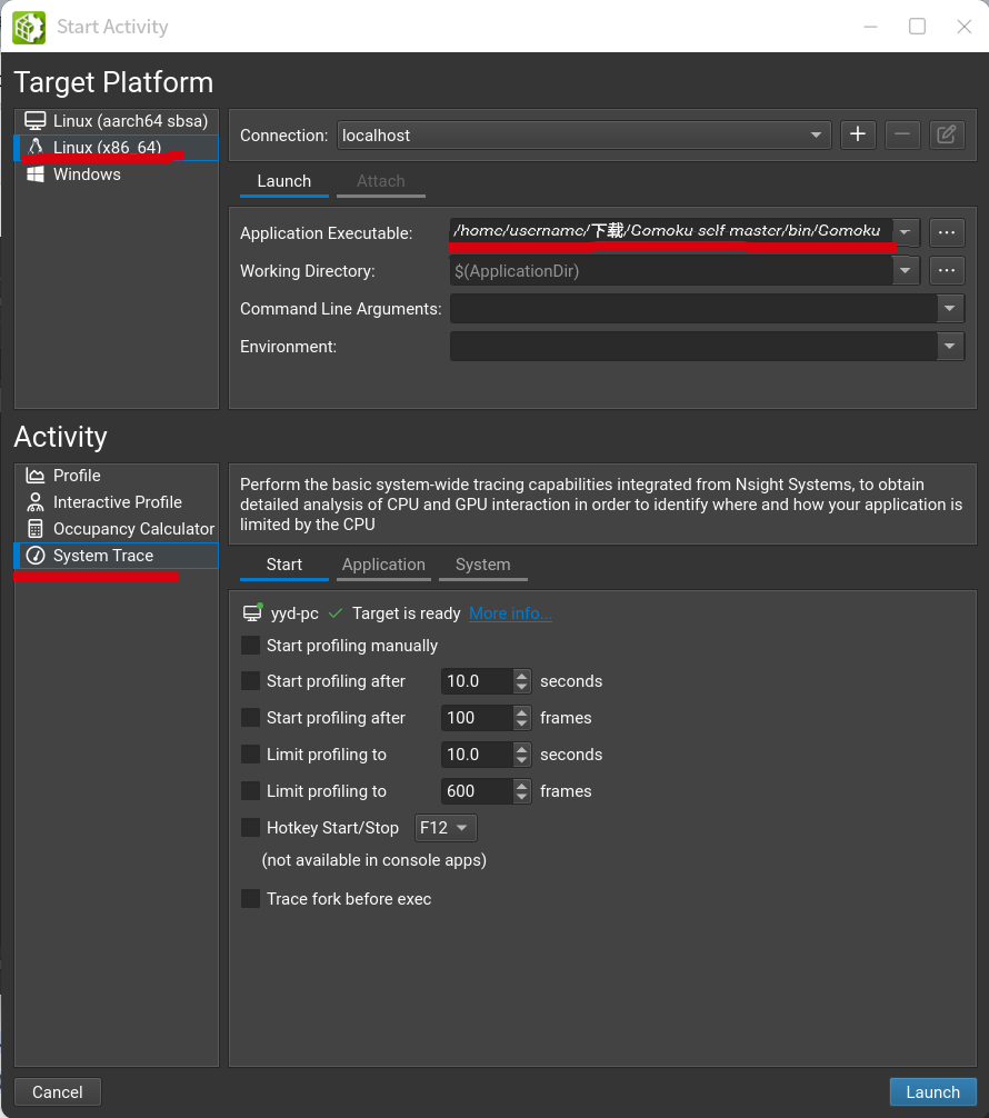 - 选择以下几个选项后点击右下角lunch(注意Application Executable选择刚刚编译到bin目录的Gomoku可执行文件)