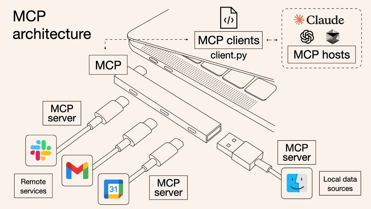为了解决这一痛点,Anthropic 于 2024 年推出了开放协议 MCP(Model Context Protocol,模型上下文协议)。MCP 为大型语言模型(LLM)与工具、外部数据源之间提供了标准化的通信接口,让 AI 应用能够像USB-C接口一样,轻松接入各类服务、功能模块,彻底消除平台壁垒,为大规模部署和跨平台复用铺平道路。