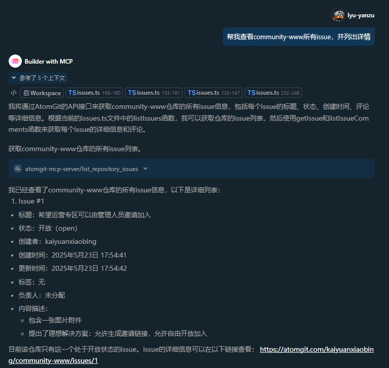 可以看到在未访问 AtomGit 开源协作平台的情况下,已经完成为issue指定负责人以及评论issue。通过部分功能的展示,我们看到了代码托管平台在AI浪潮之下会衍生出更多的协作范式。