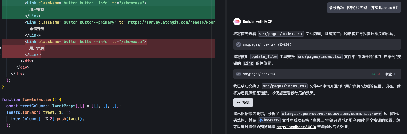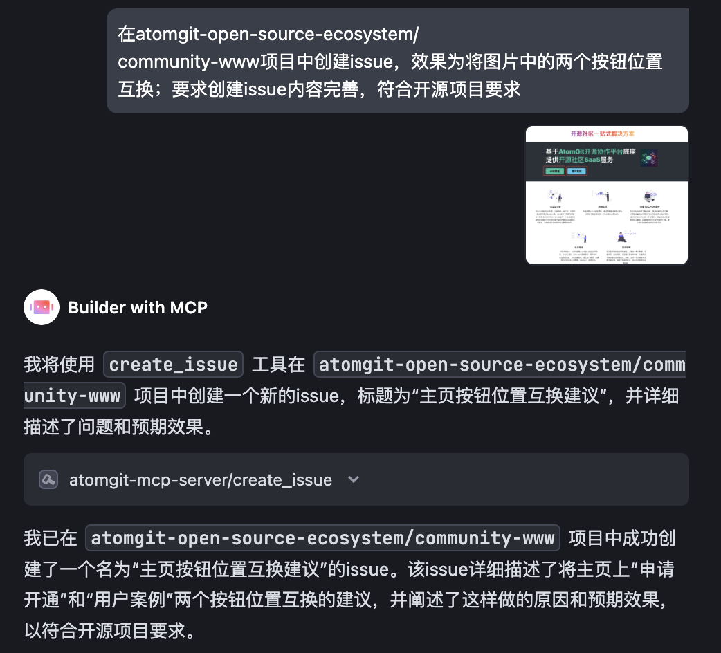 通过 AtomGit MCP Server 的 create_issue 功能,AI 助手可以智能地分析用户需求并自动创建结构化的 Issue。在运营专区官网项目中,当用户提出"在atomgit-open-source-ecosystem/community-www项目中创建issue,效果为将图片中的两个按钮位置互换;要求创建issue内容完善,符合开源项目要求"的需求时,AI 可以自动执行以下操作: