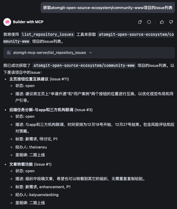 贡献者通过 AtomGit 平台的 fork 功能获取项目副本后,可以使用自然语言获取当前仓库的开发需求。AI 会根据项目上下文和 MCP 提供的信息,深入理解并解析项目需求。