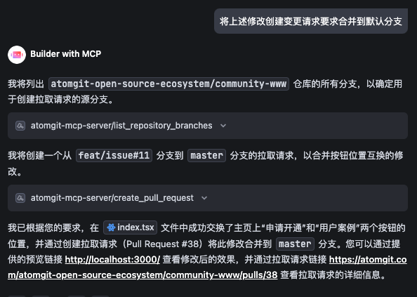 通过 AtomGit MCP Server 的 create_pull_request 功能,AI 可以自动创建和管理变更请求。这个过程包括