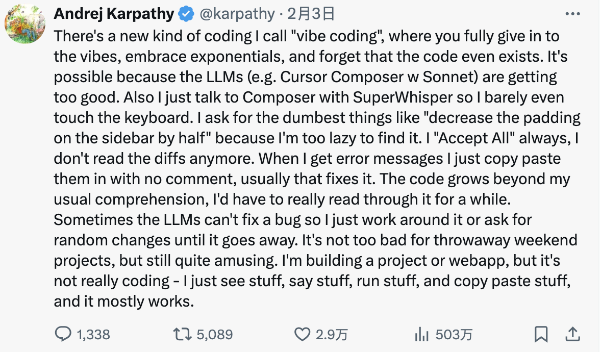 这种编程方式的革命性在于它将程序设计的重点从语法和手动编码转移到高阶设计和想法表达上。开发者不再需要纠结于具体的语法细节,而是可以将注意力集中在业务逻辑和创意实现上。正如 Karpathy 所言:"这不是真正的编码——我只是看东西、说东西、执行东西和复制粘贴东西,而且大部分都能执行"。这种描述准确地概括了 Vibe Coding 的工作模式:通过自然语言交互,让 AI 承担繁重的编码工作,开发者则专注于指导和创意输出。