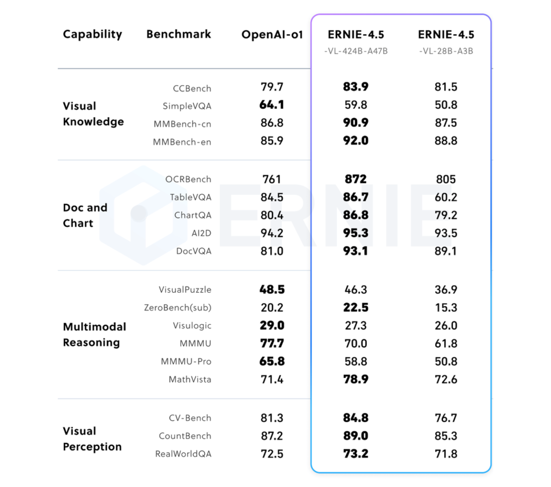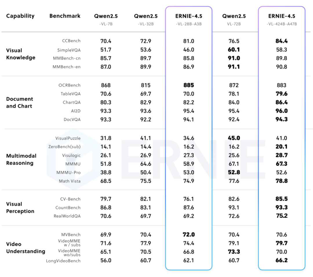 文心4.5系列模型均使用飞桨深度学习框架进行高效训练、推理和部署。在大语言模型的预训练中,模型FLOPs利用率(MFU)达到47%。实验结果显示,该系列模型在多个文本和多模态基准测试中达到SOTA水平,在指令遵循、世界知识记忆、视觉理解和多模态推理任务上效果尤为突出。模型权重按照Apache 2.0协议开源,支持开展学术研究和产业应用。此外,基于飞桨提供开源的产业级开发套件,广泛兼容多种芯片,降低后训练和部署门槛。