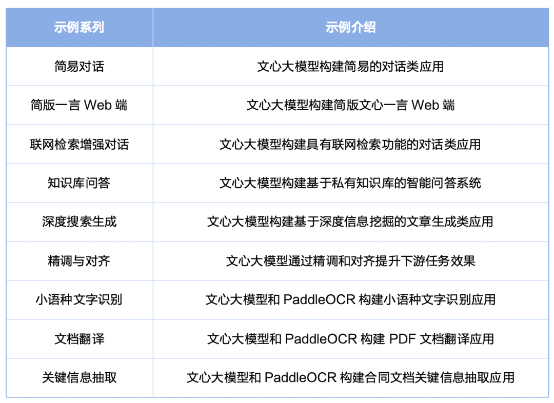 为方便社区开发者适配和拓展应用场景,我们提供了文心大模型多种能力的技术实践手册,涵盖对话、检索增强、知识库问答以及 SFT/DPO 模型微调示例,欢迎大家在星河社区应用中心与精品项目中使用与探索!