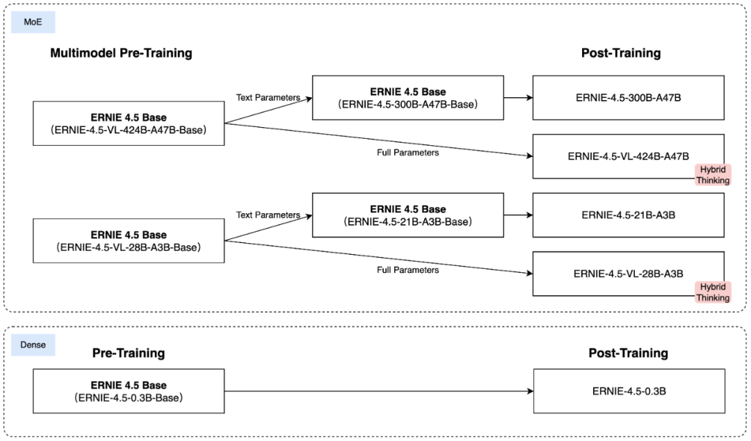 文心4.5系列开源模型共10款,涵盖了激活参数规模分别为47B和3B的混合专家(MoE)模型(最大的模型总参数量为424B),以及0.3B的稠密参数模型。