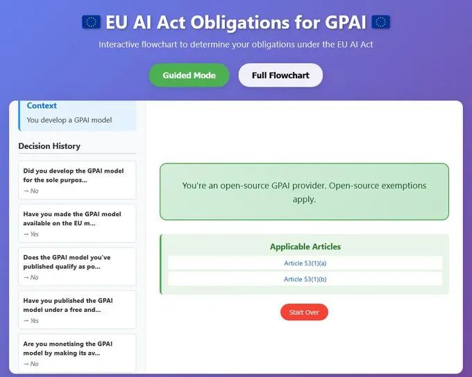 这个应用程序可以帮助开源开发者评估他们的 GPAI 模型项目是否使其符合《人工智能法》下“GPAI 模型提供者”的定义。如果是,那么有哪些相关义务需要遵守。你也可以在 Hugging Face Space 中查看更全面、更独立的版本。