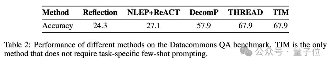 在需要多跳推理和工具使用的研究型任务上,Datacommons QA基准测试TIM达到了67.9%的准确率,与使用4000多token任务特定提示的Thread方法持平,但TIM只需要简洁的系统消息和工具描述。