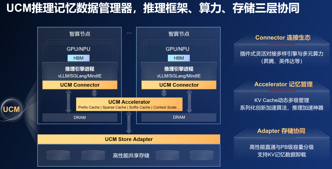 “UCM将通过开放统一的南北向接口,适配多类型推理引擎框架、算力及存储系统,最终逐步贡献给业界主流推理引擎社区。”周跃峰表示。
