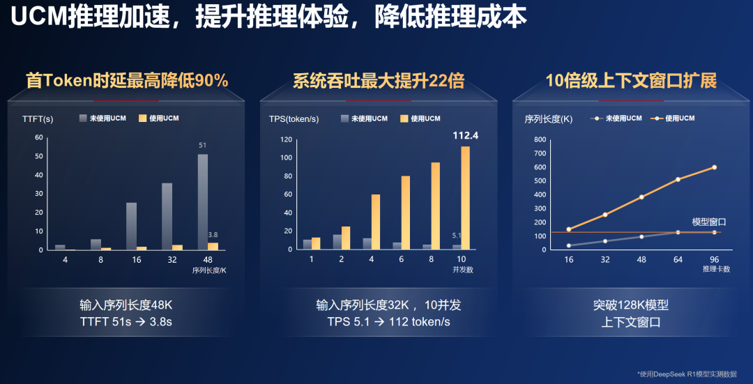 然而,可以预见的是,随着AI处理的任务越来越多,UCM所建立的数据库也会越来越庞大,无论是查询还是计算,所需调用的算力资源必然会越来越多。“为解决这一局面,UCM搭载智能分级缓存能力,这也是能够实现分层卸载、以查代算的底层能力支撑。”周跃峰介绍道,“UCM能够记忆热度在HBM(热数据)、DRAM(温数据)和SSD(冷数据)等不同成本和速度的存储介质中实现按需流动,并融合多种稀疏注意力算法,帮助AI在海量数据中只聚焦于与当前任务最相关的关键信息,实现精细化资源调度。”从实机测试结果看,在UCM加持下,长序列场景下的系统吞吐量实现了2-22倍提升,显著降低了每Token的推理成本。