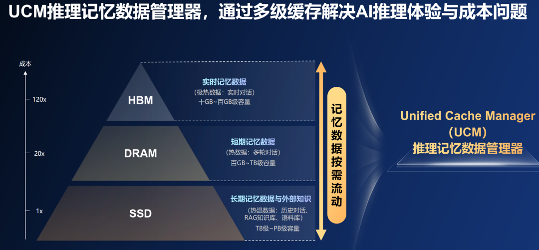 记者了解到,为了解决GPU容量不足带来的KV Cache丢失问题,UCM提出将KV Cache“分层卸载”的解决方案,根据KV Cache的重要性和时效性将其分类,将最核心的信息保存在可即时调用的核心内存中,相对次要的信息则被卸载至外置高性能存储装置中,作为“长期记忆”备用。通过这种创新的算法和架构,UCM突破了物理资源的限制,实现了推理上下文窗口的10倍级扩展,大幅提升了AI进行长篇叙事和深度思考的能力,也是从根本上解决了“推不动”“推得贵”的难题。