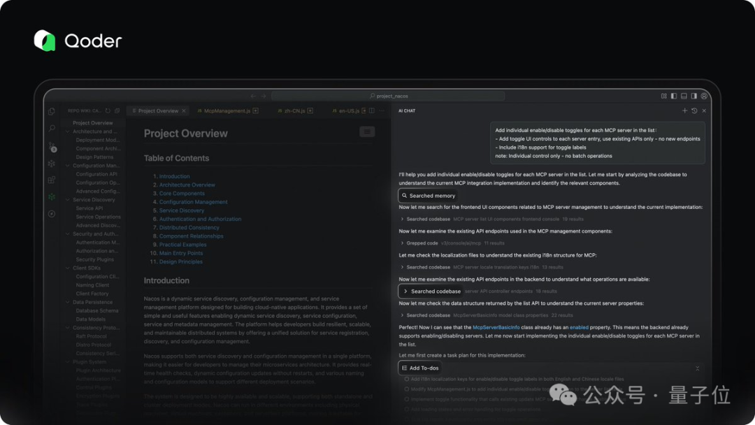 首先,Qoder 能够深度分析用户的代码库,并将其隐藏的结构、设计和逻辑自动生成一份清晰的、人人都能看懂的文档(就像项目的维基百科)。