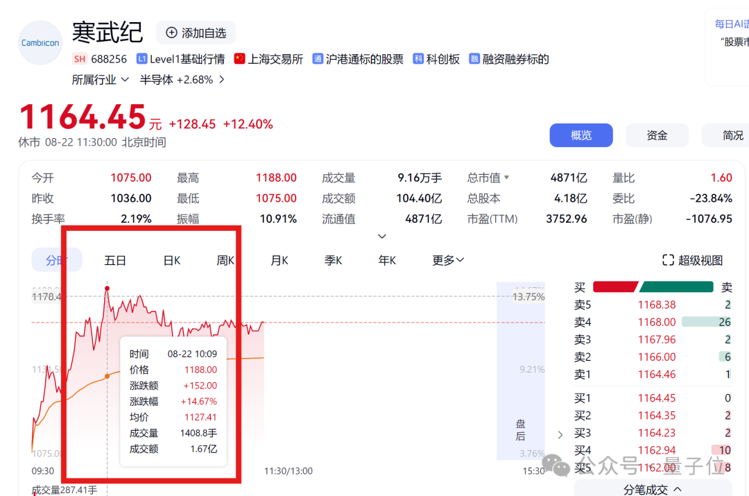 截至今日10:25,寒武纪盘中大涨近14%,总市值超4940亿元,超过中芯国际跃居科创板头名(实际以最新为准)。