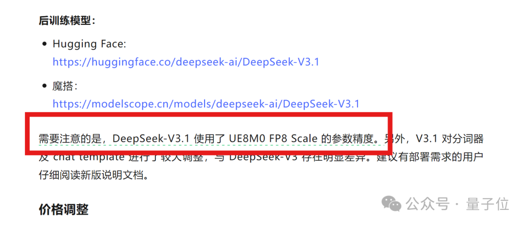 需要注意的是,DeepSeek-V3.1使用了UE8M0 FP8 Scale的参数精度。