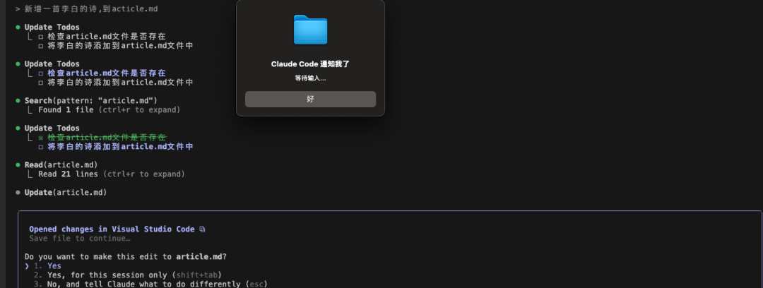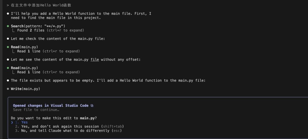 Claude 会自己找到正确的文件,并且更改和编辑时也会请求相应的权限批准。如果选择第2点,则当前会话进行期间,遇到文件编辑便不再请求权限。