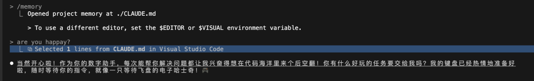 通过/memory可以编辑和查看记忆。比如将通过`#`创建的记忆:请始终使用中文回复我,编辑为:请始终使用中文并始终保持幽默的语气回复我的消息。然后再次问答,效果如下: