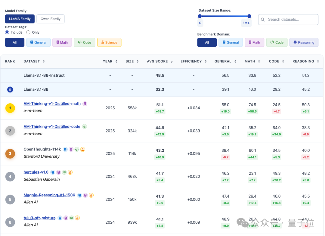 平台覆盖了来自通用、数学、代码、科学等多个领域的后训练数据集。这些数据来自于HuggingFace并且有一定的下载和关注度,不仅具有代表性,而且具备时效性,确保了评测的现实意义。