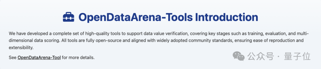 包括基于模型的训练评测工具,以及客观的多维度数据评价打分工具,所有的细节能在完整的OpenDataArena-Tool中找到说明。