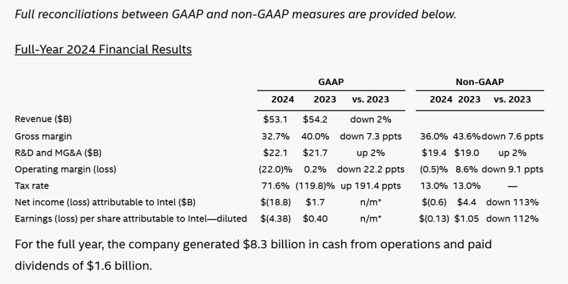 首先是财务上的巨额亏损。财报显示,英特尔在2024财年188亿美元的年度亏损,这是自1986年以来的首次年度亏损。公司的现金流状况同样堪忧,自2021年以来,其调整后的自由现金流一直为负。