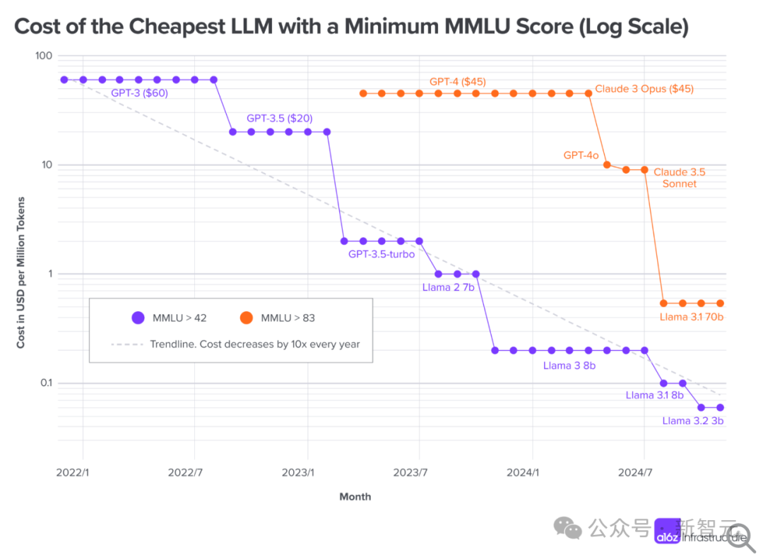 在下面的对数图中,可以看到每百万token每年成本都下降10倍。