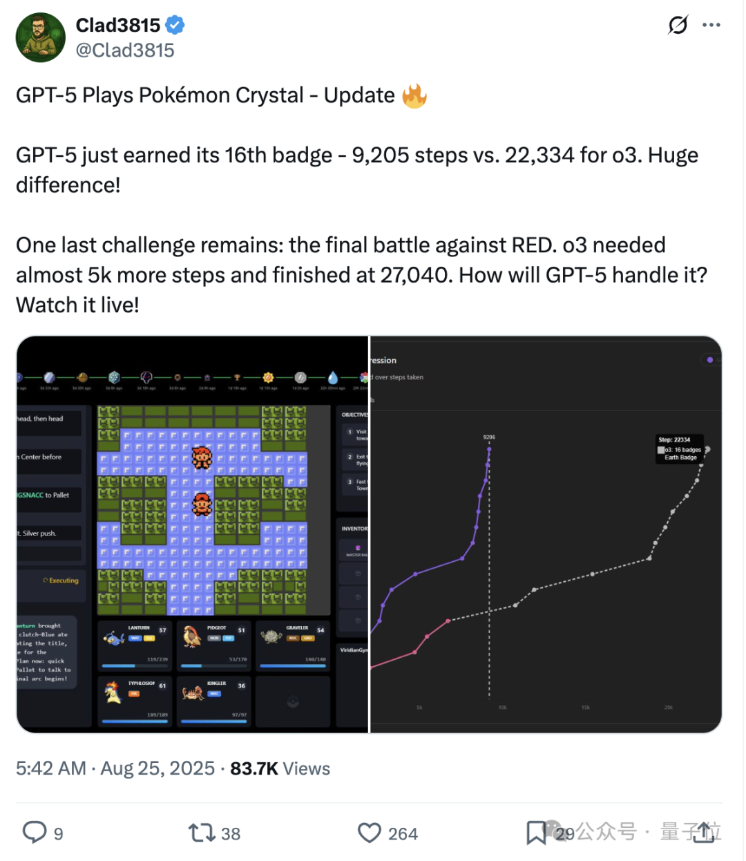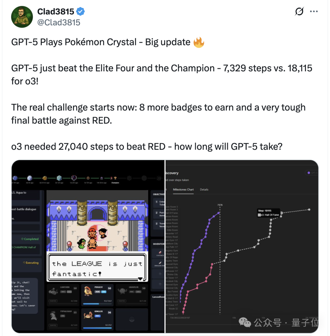 GPT-5通关《宝可梦水晶》创纪录!9517步击败赤爷,效率碾压o3三倍!