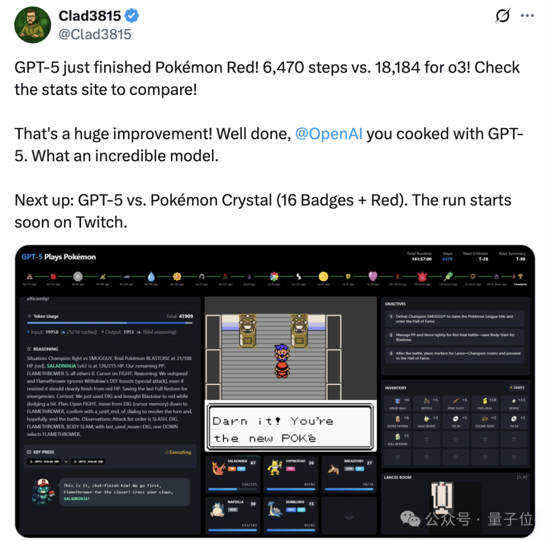 而这次,GPT-5就化身小智,成为了新的挑战者——并一举击败赤爷,登顶宝可梦。