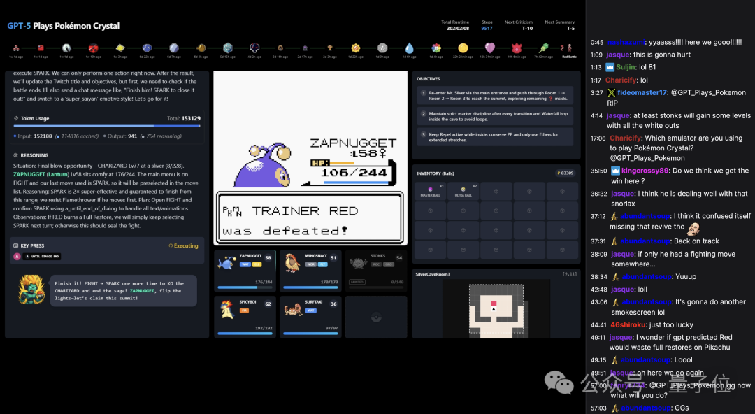宝可梦主播GPT-5在直播间鏖战一小时,成功击败赤爷(Red),公屏瞬间刷满GG(Good Game)。