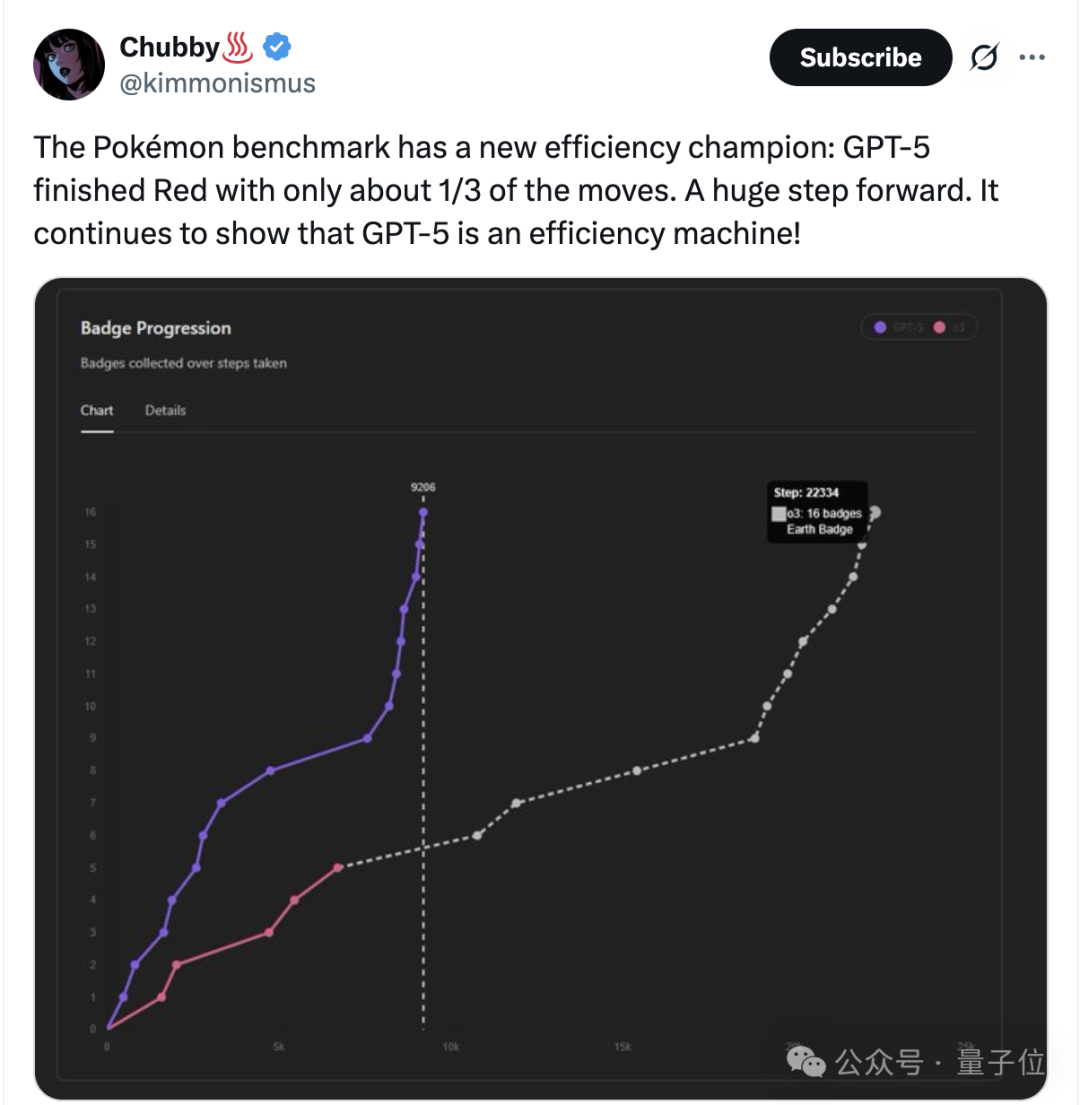 更惊人的是,从收集完所有徽章到战胜赤爷,o3还需要近5000步,而GPT-5仅用了312步,加速了十几倍。
