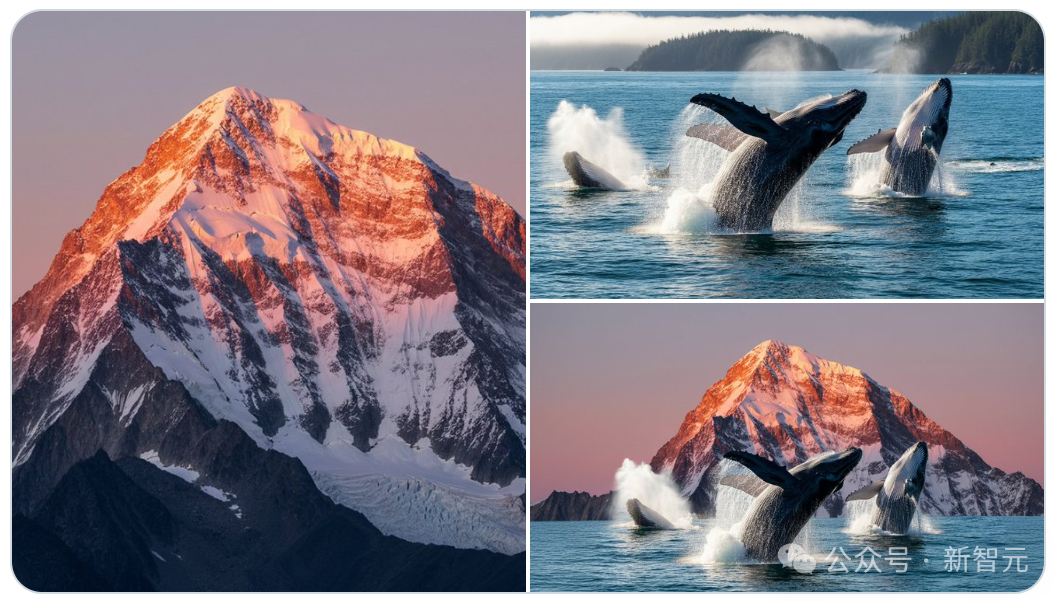 比如在山峰前跃出水面的鲸鱼。